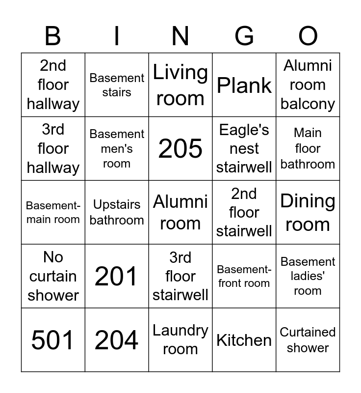 This bingo card has a free space and 24 words: 201, 204, 205, 501, Alumni room balcony, 2nd floor hallway, 3rd floor hallway, Basement stairs, 2nd floor stairwell, 3rd floor stairwell, Eagle's nest stairwell, Basement- main room, Basement-front room, Basement ladies' room, Basement men's room, Kitchen, Dining room, Living room, Main floor bathroom, Upstairs bathroom, Curtained shower, No curtain shower, Plank and Laundry room.