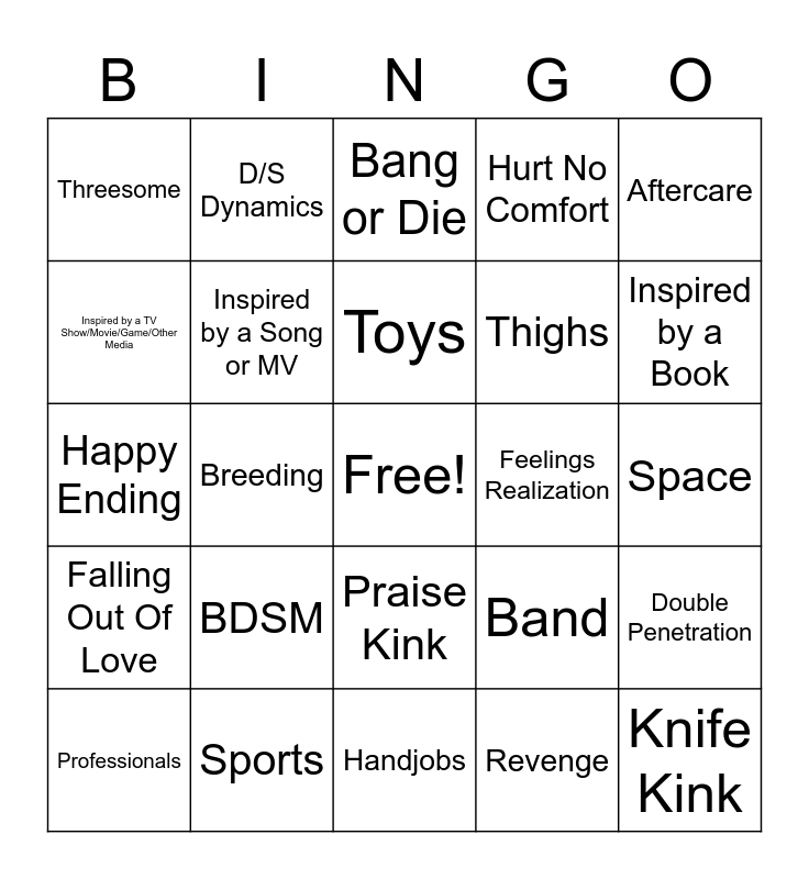 This bingo card has a free space and 24 words: BDSM, Sports, Toys, Professionals, Aftercare, Threesome, Inspired by a TV Show/Movie/Game/Other Media, D/S Dynamics, Feelings Realization, Praise Kink, Thighs, Happy Ending, Band, Double Penetration, Inspired by a Song or MV, Revenge, Space, Bang or Die, Inspired by a Book, Breeding, Knife Kink, Falling Out Of Love, Hurt No Comfort and Handjobs.