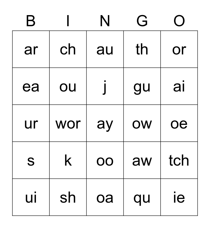 This bingo card has 25 words: k, oa, j, ui, or, ar, ea, ch, ow, oo, gu, ur, aw, tch, ou, ie, oe, au, ai, wor, ay, sh, s, th and qu.