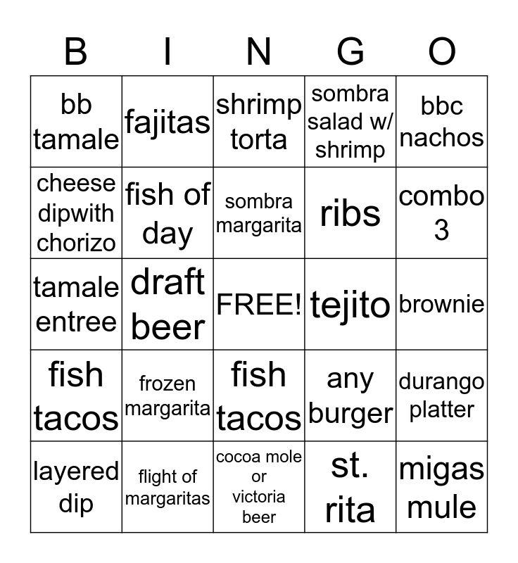 This bingo card has a free space and 24 words: frozen margarita, flight of margaritas, sombra margarita, layered dip, bbc nachos, bb tamale, cheese dipwith chorizo, fajitas, tejito, fish tacos, ribs, tamale entree, any burger, durango platter, fish of day, st. rita, brownie, shrimp torta, combo 3, draft beer, migas mule, fish tacos, sombra salad w/ shrimp and cocoa mole or victoria beer.