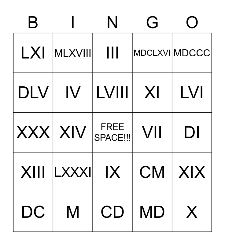 This bingo card has a free space and 24 words: LXXXI, M, LVIII, DC, MDCCC, LXI, DLV, MLXVIII, VII, IX, XI, XXX, CM, XIX, IV, MD, DI, III, LVI, XIV, X, XIII, MDCLXVI and CD.