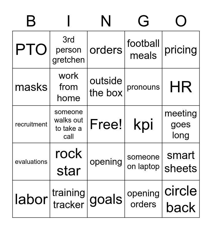 This bingo card has a free space and 39 words: appreciate you, safety momment, invoices, work from home, labor, opening, outside the box, budgets, pricing, evaluations, someone walks out to take a call, football meals, circle back, meeting goes long, kpi, rock star, opportunity, PTO, time compliance, someone on laptop, masks, goals, pronouns, HR, meeting starts late, phone rings, agenda, someone has a side conversation, icebreaker, 3rd person gretchen, refresh, interns, orders, training tracker, opening orders, inventory, smart sheets, recruitment and safety champion.