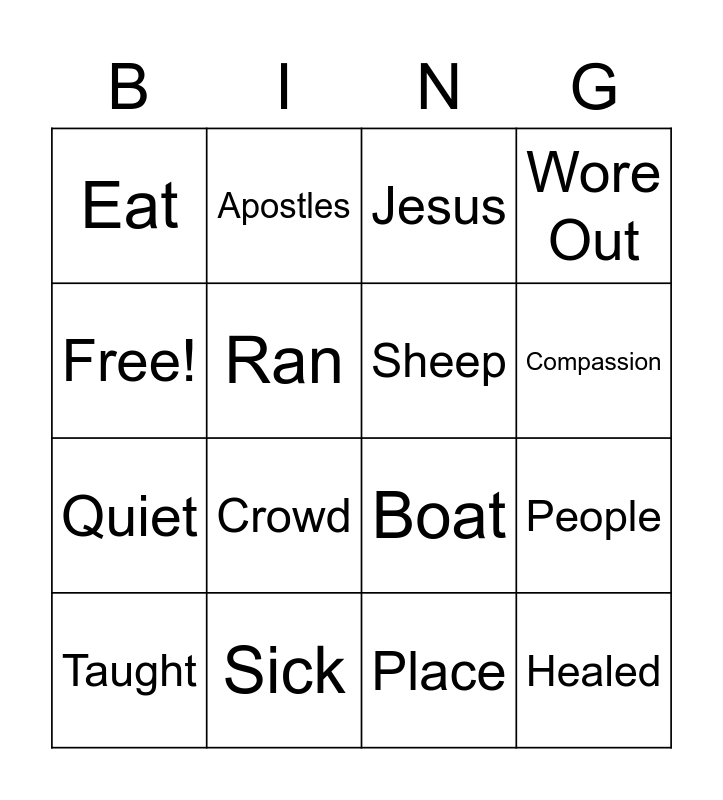 This bingo card has 16 words: Sick, People, Jesus, Eat, Quiet, Apostles, Boat, Place, Free!, Ran, Taught, Wore Out, Crowd, Compassion, Sheep and Healed.