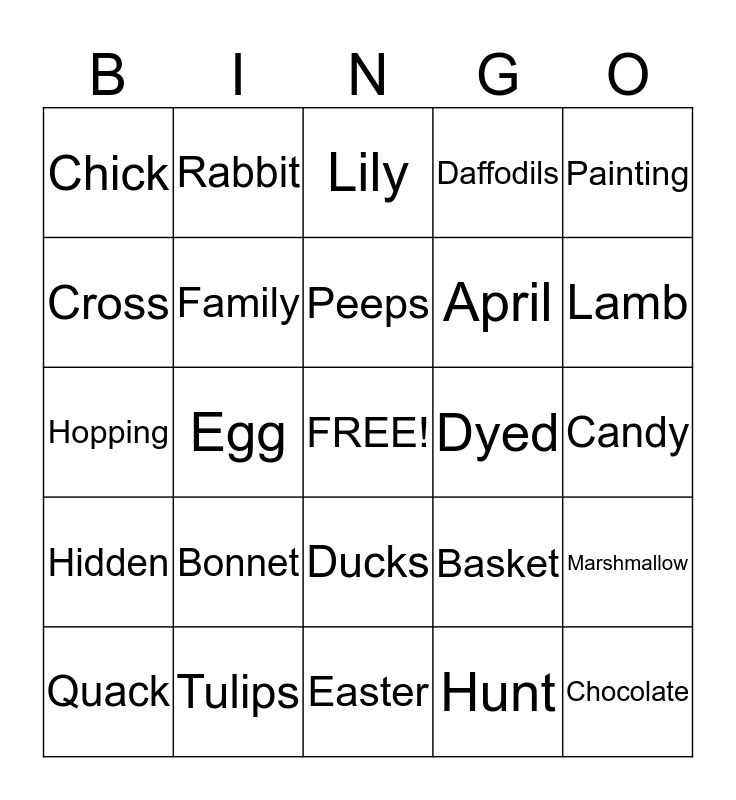 This bingo card has a free space and 31 words: Easter, Spring, Egg, Bunny, Chick, Lily, Family, Basket, Dyed, Hunt, Candy, Chocolate, Jellybeans, Sunday, Lamb, Grass, Marshmallow, Bonnet, Hidden, Ducks, Painting, Paste, Quack, Rabbit, April, Cross, Daffodils, Hopping, Tulips, Peeps and Flowers.