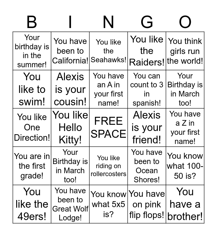 This bingo card has a free space and 24 words: Your Birthday is in March too!, You have been to Great Wolf Lodge!, You have an A in your first name!, You like the 49ers!, You think girls run the world!, Your birthday is in the summer!, You like to swim!, You have been to California!, Alexis is your friend!, You like riding on rollercosters, You can count to 3 in spanish!, You like One Direction!, You have been to Ocean Shores!, You know what 100-50 is?, Alexis is your cousin!, You have on pink flip flops!, You have a Z in your first name!, You like the Seahawks!, Your Birthday is in March too!, You like Hello Kitty!, You have a brother!, You are in the first grade!, You like the Raiders! and You know what 5x5 is?.