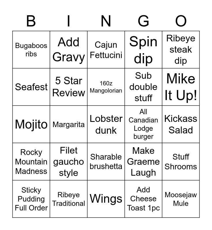 This bingo card has 25 words: Filet gaucho style, Wings, 160z Mangolorian, Sticky Pudding Full Order, Ribeye steak dip, Bugaboos ribs, Seafest, Add Gravy, All Canadian Lodge burger, Sharable brushetta, Sub double stuff, Mojito, Make Graeme Laugh, Stuff Shrooms, 5 Star Review, Moosejaw Mule, Kickass Salad, Cajun Fettucini, Mike It Up!, Margarita, Lobster dunk, Ribeye Traditional, Rocky Mountain Madness, Spin dip and Add Cheese Toast 1pc.