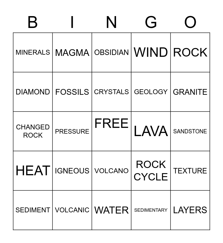 This bingo card has a free space and 24 words: IGNEOUS, VOLCANIC, CRYSTALS, SEDIMENT, ROCK, MINERALS, DIAMOND, MAGMA, LAVA, VOLCANO, GEOLOGY, CHANGED ROCK, ROCK CYCLE, TEXTURE, FOSSILS, SEDIMENTARY, SANDSTONE, OBSIDIAN, GRANITE, PRESSURE, LAYERS, HEAT, WIND and WATER.