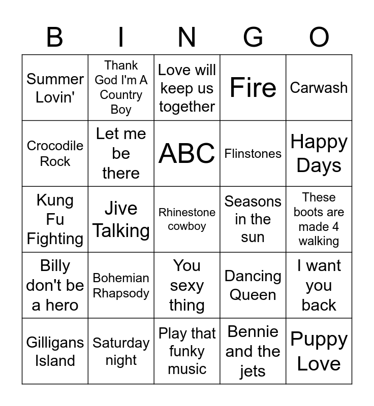 This bingo card has 25 words: Bohemian Rhapsody, Play that funky music, ABC, Gilligans Island, Carwash, Summer Lovin', Crocodile Rock, Thank God I'm A Country Boy, Seasons in the sun, You sexy thing, Flinstones, Kung Fu Fighting, Dancing Queen, I want you back, Let me be there, Puppy Love, These boots are made 4 walking, Love will keep us together, Happy Days, Jive Talking, Rhinestone cowboy, Saturday night, Billy don't be a hero, Fire and Bennie and the jets.