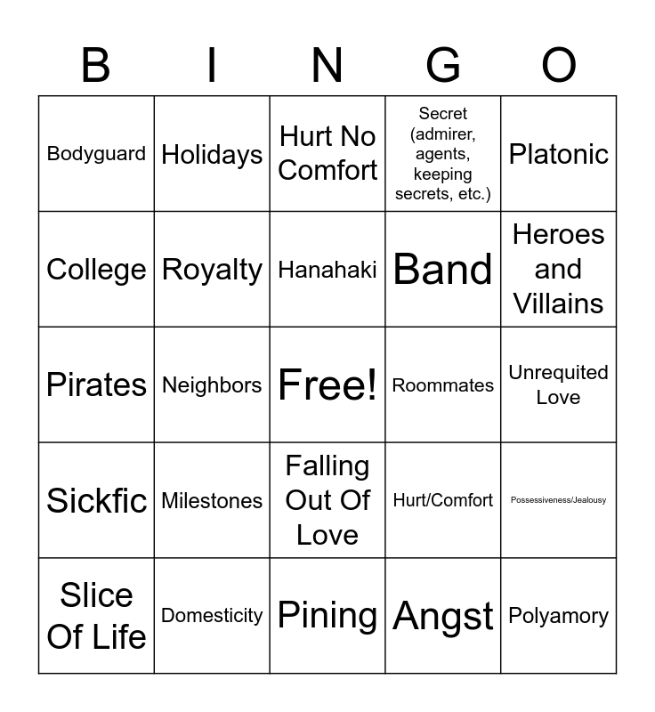 This bingo card has a free space and 24 words: Milestones, Domesticity, Hanahaki, Slice Of Life, Platonic, Bodyguard, College, Holidays, Roommates, Falling Out Of Love, Band, Pirates, Hurt/Comfort, Possessiveness/Jealousy, Royalty, Angst, Unrequited Love, Hurt No Comfort, Heroes and Villains, Neighbors, Polyamory, Sickfic, Secret (admirer, agents, keeping secrets, etc.) and Pining.