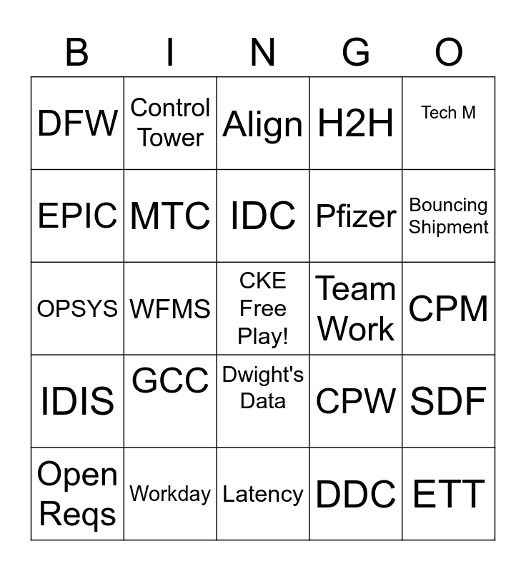 This bingo card has a free space and 24 words: GCC, Workday, IDC, Open Reqs, Tech M, DFW, EPIC, Control Tower, Team Work, Dwight's Data, Pfizer, OPSYS, CPW, SDF, MTC, DDC, CPM, Align, Bouncing Shipment, WFMS, ETT, IDIS, H2H and Latency.