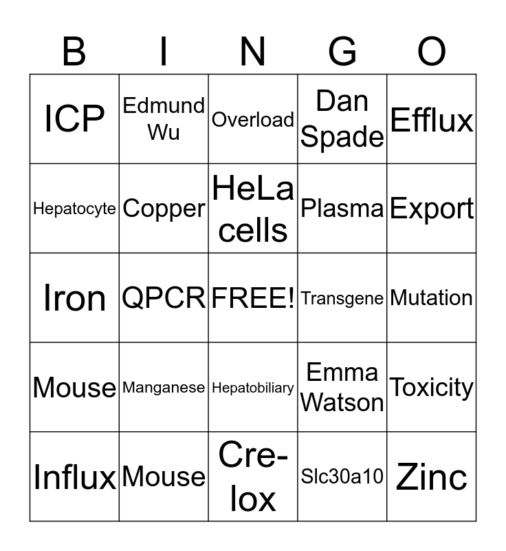 This bingo card has a free space and 24 words: Manganese, Mouse, HeLa cells, Influx, Efflux, ICP, Hepatocyte, Edmund Wu, Transgene, Hepatobiliary, Plasma, Iron, Emma Watson, Toxicity, Copper, Slc30a10, Mutation, Overload, Export, QPCR, Zinc, Mouse, Dan Spade and Cre-lox.