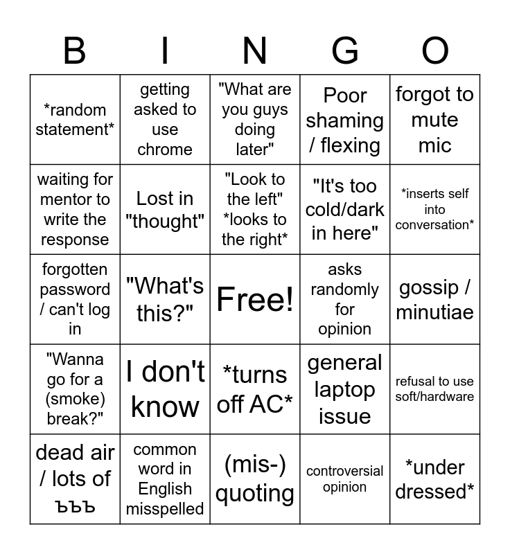 This bingo card has a free space and 24 words: I don't know, common word in English misspelled, "Look to the left" *looks to the right*, dead air / lots of ъъъ, forgot to mute mic, *random statement*, waiting for mentor to write the response, getting asked to use chrome, asks randomly for opinion, *turns off AC*, "It's too cold/dark in here", forgotten password / can't log in, general laptop issue, refusal to use soft/hardware, Lost in "thought", controversial opinion, gossip / minutiae, "What are you guys doing later", *inserts self into conversation*, "What's this?", *under dressed*, "Wanna go for a (smoke) break?", Poor shaming / flexing and (mis-) quoting.