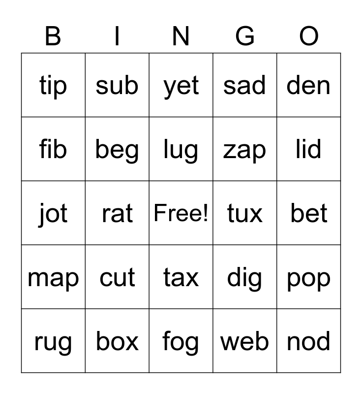 This bingo card has a free space and 24 words: cut, box, lug, rug, den, tip, fib, sub, tux, tax, zap, jot, dig, pop, beg, web, bet, yet, lid, rat, nod, map, sad and fog.