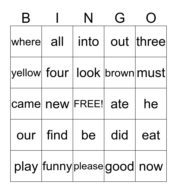 This bingo card has a free space and 24 words: find, funny, look, play, three, where, yellow, all, ate, be, brown, came, did, eat, four, good, he, into, must, new, now, our, out and please.