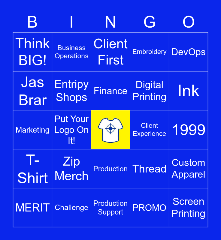 This bingo card has a free space and 34 words: HR, PROMO, Business Development, OWN IT, T-Shirt, Entripy Shops, DevOps, MERIT, Business Operations, Yellow Box, Finance, Client First, Entripy Does it Best!, SPEED, Client Experience, Ink, Challenge, Marketing, Zip Merch, Thread, Production, Slaite, Think BIG!, 1999, Production Support, Screen Printing, Embroidery, Heat Transfer, Digital Printing, Jas Brar, Packaging & Shipping, Put Your Logo On It!, Custom Apparel and Logistics.