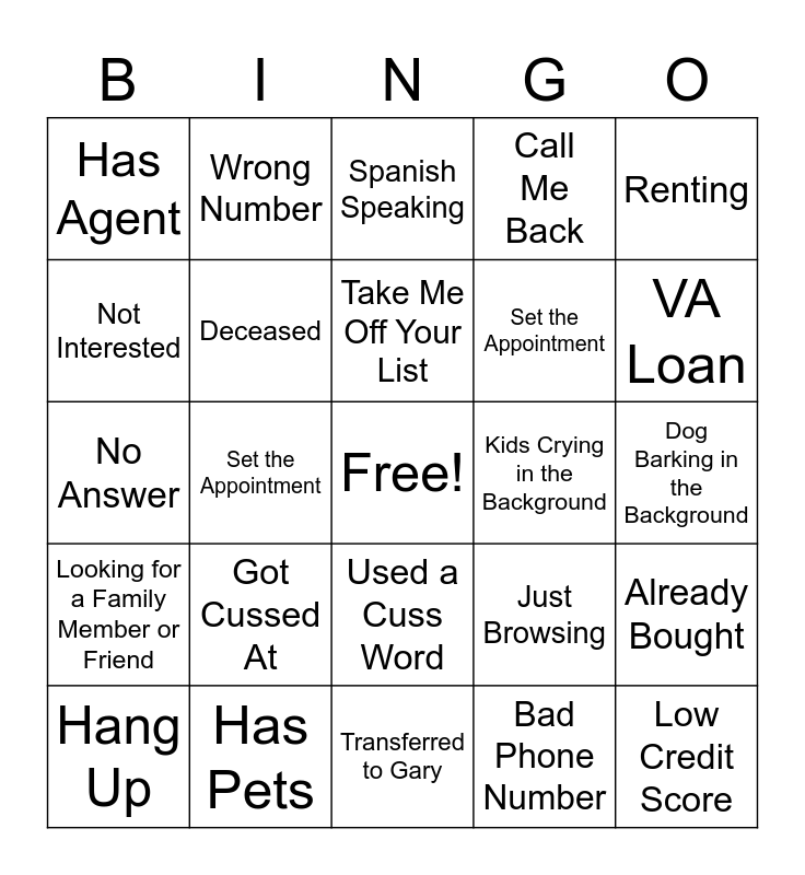 This bingo card has a free space and 25 words: Hang Up, Got Cussed At, Take Me Off Your List, Bad Phone Number, VA Loan, Has Agent, Wrong Number, Spanish Speaking, Set the Appointment, Already Bought, No Answer, Deceased, Just Browsing, Low Credit Score, Not Interested, Has Pets, Transferred to Gary, Call Me Back, Dog Barking in the Background, Looking for a Family Member or Friend, Set the Appointment, Used a Cuss Word, Kids Crying in the Background, Renting and Just Renting.