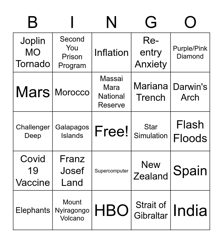 This bingo card has a free space and 24 words: Franz Josef Land, Mount Nyiragongo Volcano, Massai Mara National Reserve, Elephants, Purple/Pink Diamond, Joplin MO Tornado, Mars, Second You Prison Program, Star Simulation, Supercomputer, Mariana Trench, Challenger Deep, New Zealand, Spain, Morocco, Strait of Gibraltar, Flash Floods, Inflation, Darwin's Arch, Galapagos Islands, India, Covid 19 Vaccine, Re-entry Anxiety and HBO.