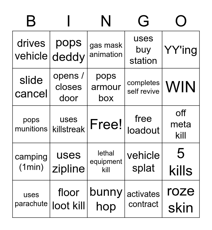 This bingo card has a free space and 25 words: uses zipline, bunny hop, pops armour box, uses parachute, YY'ing, drives vehicle, slide cancel, pops deddy, free loadout, lethal equipment kill, completes self revive, pops munitions, vehicle splat, 5 kills, opens / closes door, meta kill, off meta kill, gas mask animation, WIN, uses killstreak, roze skin, floor loot kill, camping (1min), uses buy station and activates contract.