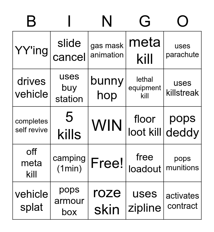 This bingo card has 26 words: Free!, uses zipline, bunny hop, pops armour box, uses parachute, YY'ing, drives vehicle, slide cancel, pops deddy, free loadout, lethal equipment kill, completes self revive, pops munitions, vehicle splat, 5 kills, opens / closes door, meta kill, off meta kill, gas mask animation, WIN, uses killstreak, roze skin, floor loot kill, camping (1min), uses buy station and activates contract.