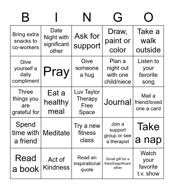 This bingo card has a free space and 24 words: Meditate, Act of Kindness, Give someone a hug, Read a book, Take a walk outside, Bring extra snacks to co-workers, Give yourself a daily compliment, Date Night with significant other, Journal, Try a new fitness class, Plan a night out with one child/niece, Three things you are grateful for, Join a support group or see a therapist, Take a nap, Pray, Small gift for a friend/significant other, Mail a friend/loved one a card, Ask for support, Listen to your favorite song, Eat a healthy meal, Watch your favorite t.v. show, Spend time with a friend, Draw, paint or color and Read an inspirational quote.