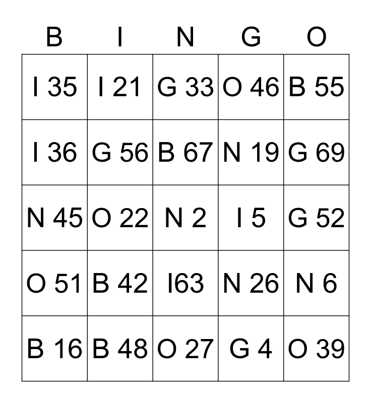 This bingo card has a free space and 24 words: B 42, B 48, B 67, B 16, B 55, I 35, I 36, I 21, I 5, I63, N 19, N 45, N 26, N 6, G 56, G 4, G 52, G 33, G 69, O 22, O 39, O 51, O 46 and O 27.