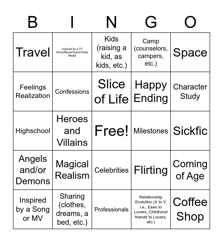 This bingo card has a free space and 24 words: Magical Realism, Sharing (clothes, dreams, a bed, etc.), Slice of Life, Inspired by a Song or MV, Space, Travel, Feelings Realization, Inspired by a TV Show/Movie/Game/Other Media, Milestones, Celebrities, Happy Ending, Highschool, Flirting, Coming of Age, Confessions, Relationship Evolution (X to Y, i.e., Exes to Lovers, Childhood friends to Lovers, etc.), Sickfic, Kids (raising a kid, as kids, etc.), Character Study, Heroes and Villains, Coffee Shop, Angels and/or Demons, Camp (counselors, campers, etc.) and Professionals.