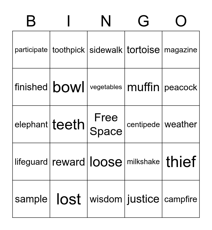 This bingo card has a free space and 24 words: reward, lost, vegetables, sample, magazine, participate, finished, toothpick, centipede, loose, muffin, elephant, milkshake, thief, bowl, justice, weather, sidewalk, peacock, teeth, campfire, lifeguard, tortoise and wisdom.