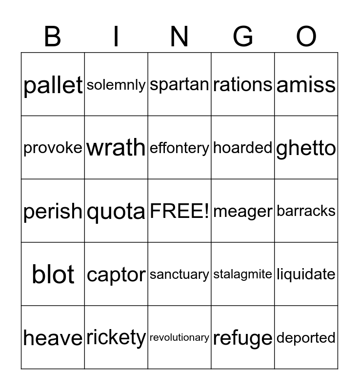 This bingo card has a free space and 24 words: captor, rickety, effontery, heave, amiss, pallet, provoke, solemnly, meager, sanctuary, hoarded, perish, stalagmite, liquidate, wrath, refuge, barracks, spartan, ghetto, quota, deported, blot, rations and revolutionary.