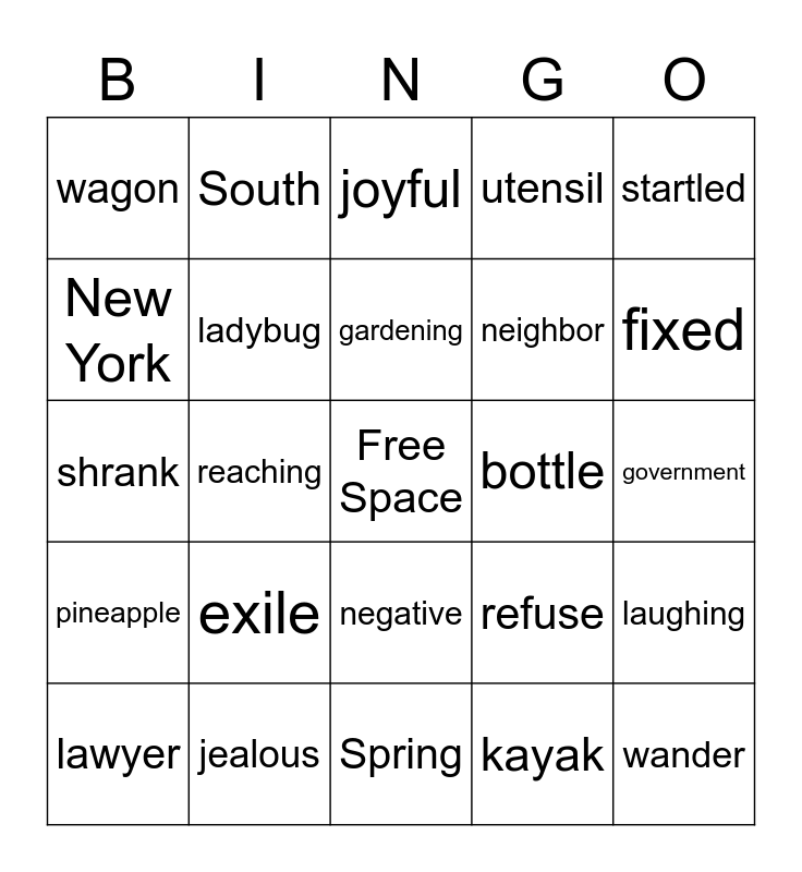 This bingo card has a free space and 24 words: exile, jealous, gardening, lawyer, startled, wagon, New York, South, bottle, negative, neighbor, shrank, refuse, laughing, ladybug, kayak, government, joyful, fixed, reaching, wander, pineapple, utensil and Spring.
