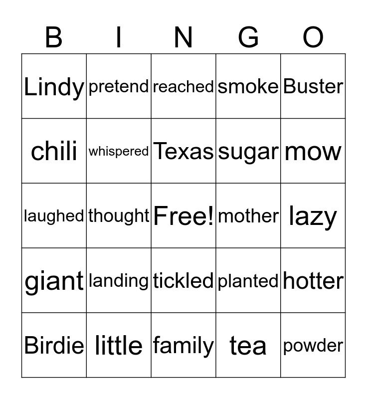 This bingo card has a free space and 24 words: landing, little, Texas, Birdie, Buster, Lindy, chili, pretend, mother, tickled, sugar, laughed, planted, hotter, whispered, tea, lazy, reached, mow, thought, powder, giant, smoke and family.