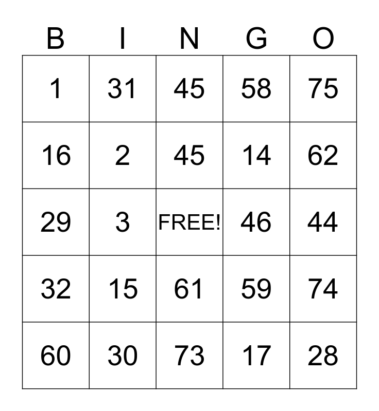 This bingo card has a free space and 24 words: 15, 30, 45, 60, 75, 1, 16, 31, 46, 61, 14, 29, 59, 74, 2, 17, 44, 45, 62, 3, 28, 32, 58 and 73.