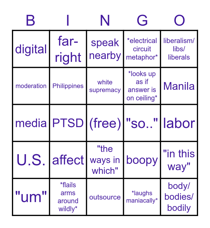 This bingo card has a free space and 24 words: affect, *flails arms around wildly*, white supremacy, "um", liberalism/ libs/ liberals, digital, moderation, far-right, "so..", "the ways in which", *looks up as if answer is on ceiling*, media, boopy, "in this way", Philippines, *laughs maniacally*, labor, speak nearby, Manila, PTSD, body/ bodies/ bodily, U.S., *electrical circuit metaphor* and outsource.