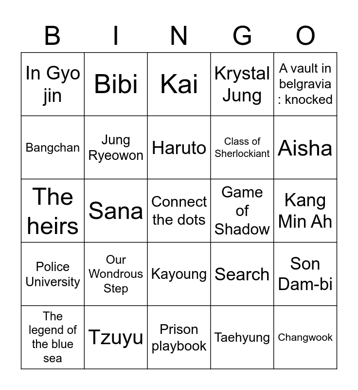 This bingo card has a free space and 24 words: Our Wondrous Step, Tzuyu, Haruto, The legend of the blue sea, A vault in belgravia : knocked, In Gyo jin, Bangchan, Bibi, Game of Shadow, Kayoung, Class of Sherlockiant, The heirs, Search, Son Dam-bi, Jung Ryeowon, Taehyung, Kang Min Ah, Kai, Aisha, Sana, Changwook, Police University, Krystal Jung and Prison playbook.
