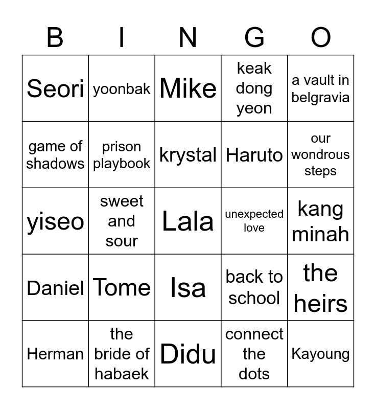 This bingo card has a free space and 24 words: Tome, the bride of habaek, krystal, Herman, a vault in belgravia, Seori, game of shadows, yoonbak, unexpected love, Isa, Haruto, yiseo, back to school, the heirs, prison playbook, connect the dots, kang minah, Mike, our wondrous steps, sweet and sour, Kayoung, Daniel, keak dong yeon and Didu.