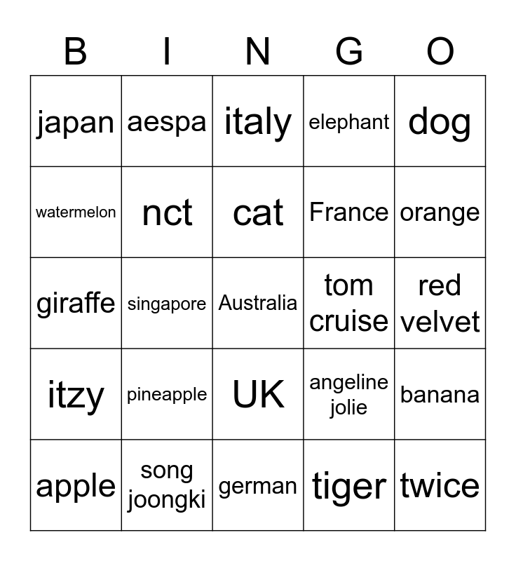 This bingo card has a free space and 24 words: pineapple, song joongki, cat, apple, dog, japan, watermelon, aespa, tom cruise, UK, France, giraffe, angeline jolie, banana, nct, tiger, red velvet, italy, orange, singapore, twice, itzy, elephant and german.