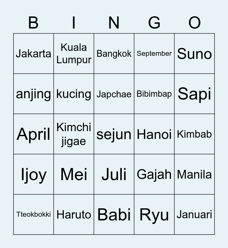 This bingo card has 25 words: Ijoy, Haruto, sejun, Ryu, Suno, Jakarta, Kuala Lumpur, Bangkok, Hanoi, Manila, anjing, kucing, Babi, Gajah, Sapi, Tteokbokki, Kimchi jigae, Japchae, Bibimbap, Kimbab, April, Mei, Juli, September and Januari.