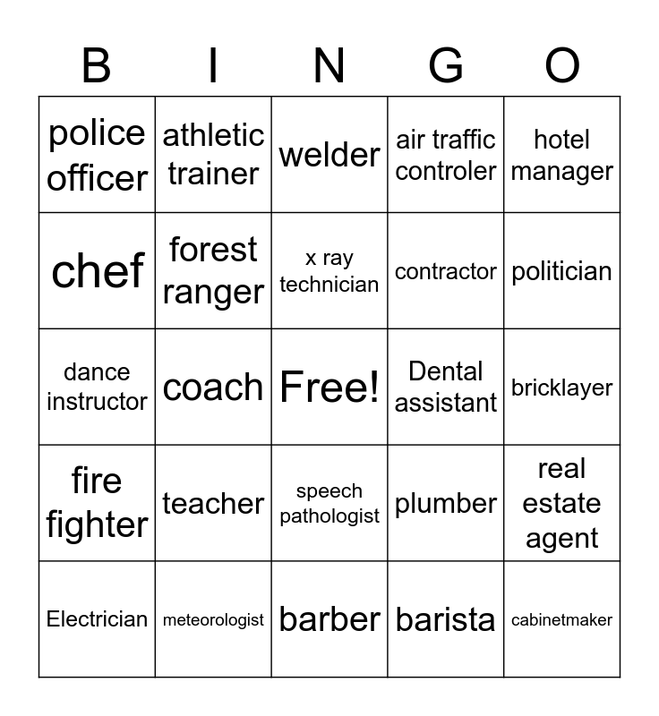 This bingo card has a free space and 29 words: Electrician, Musician, coach, loan officer, police officer, welder, forest ranger, teacher, Dental assistant, meteorologist, bricklayer, cabinetmaker, barber, barista, politician, veterinary technician, speech pathologist, fire fighter, hotel manager, dance instructor, plumber, photographer, contractor, chef, air traffic controler, athletic trainer, real estate agent, x ray technician and interior designer.