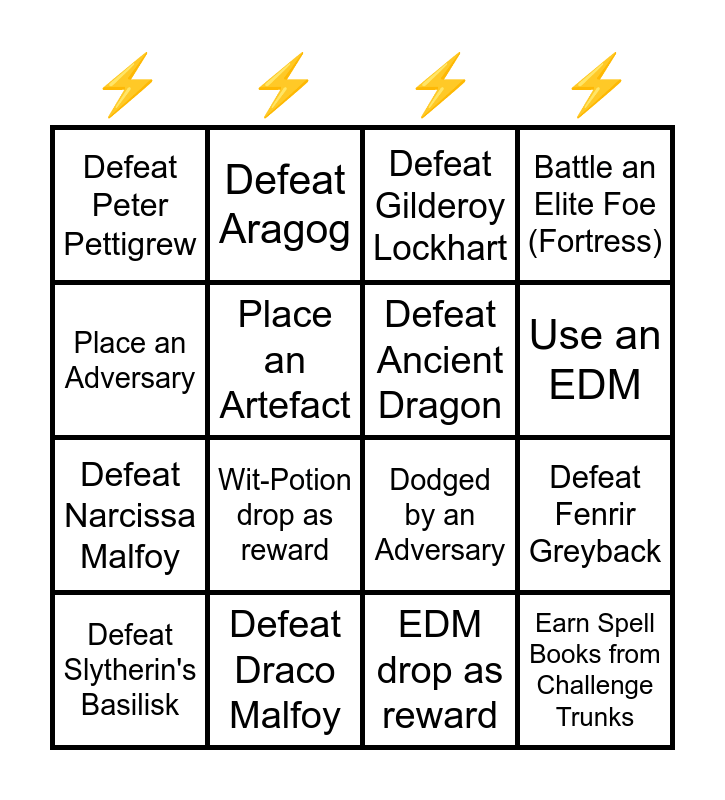 This bingo card has 16 words: Defeat Draco Malfoy, Defeat Fenrir Greyback, Defeat Gilderoy Lockhart, Defeat Peter Pettigrew, Defeat Narcissa Malfoy, Defeat Aragog, Dodged by an Adversary, EDM drop as reward, Place an Adversary, Place an Artefact, Defeat Slytherin's Basilisk, Battle an Elite Foe (Fortress), Wit-Potion drop as reward, Use an EDM, Defeat Ancient Dragon and Earn Spell Books from Challenge Trunks.