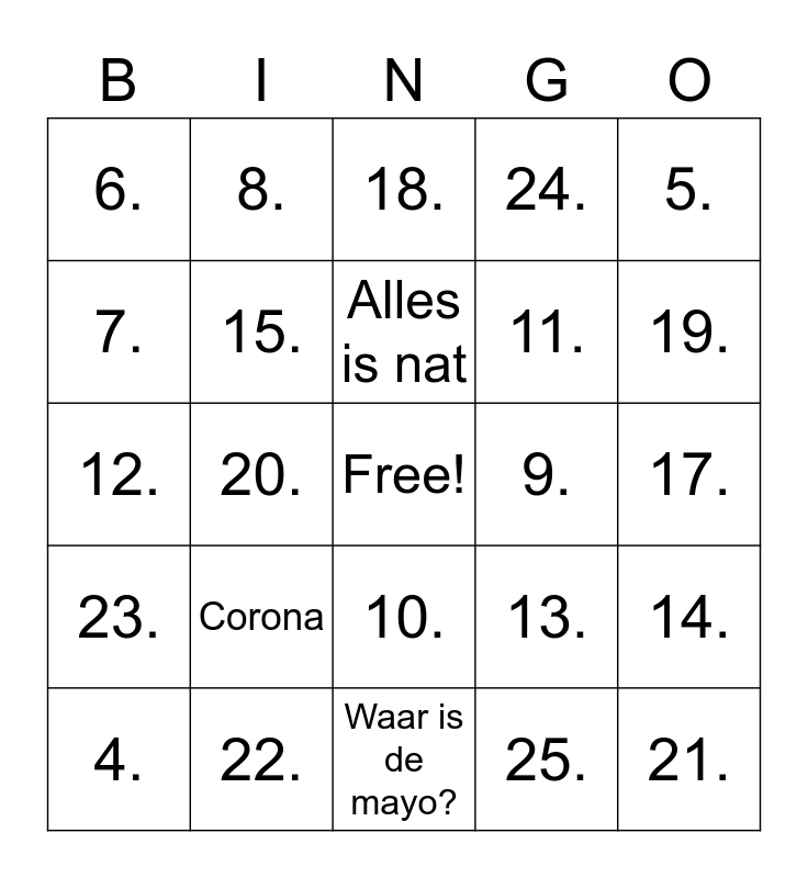 This bingo card has a free space and 25 words: Corona, Waar is de mayo?, Alles is nat, 4., 5., 6., 7., 8., 9., 10., 11., 12., 13., 14., 15., 16., 17., 18., 19., 20., 21., 22., 23., 24. and 25..