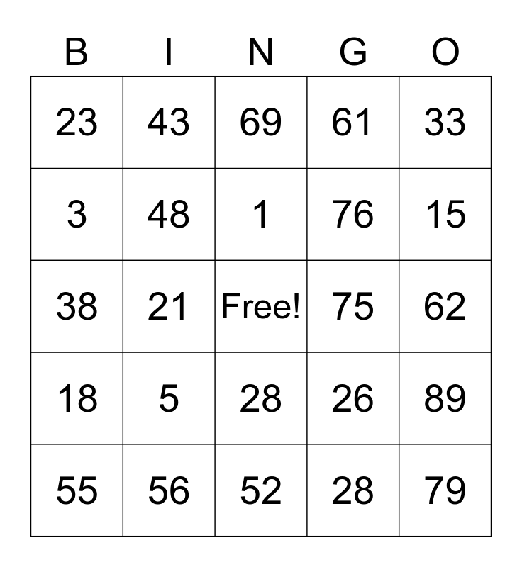 This bingo card has a free space and 24 words: 5, 56, 1, 55, 33, 23, 3, 43, 75, 28, 76, 38, 26, 89, 48, 28, 62, 69, 15, 21, 79, 18, 61 and 52.