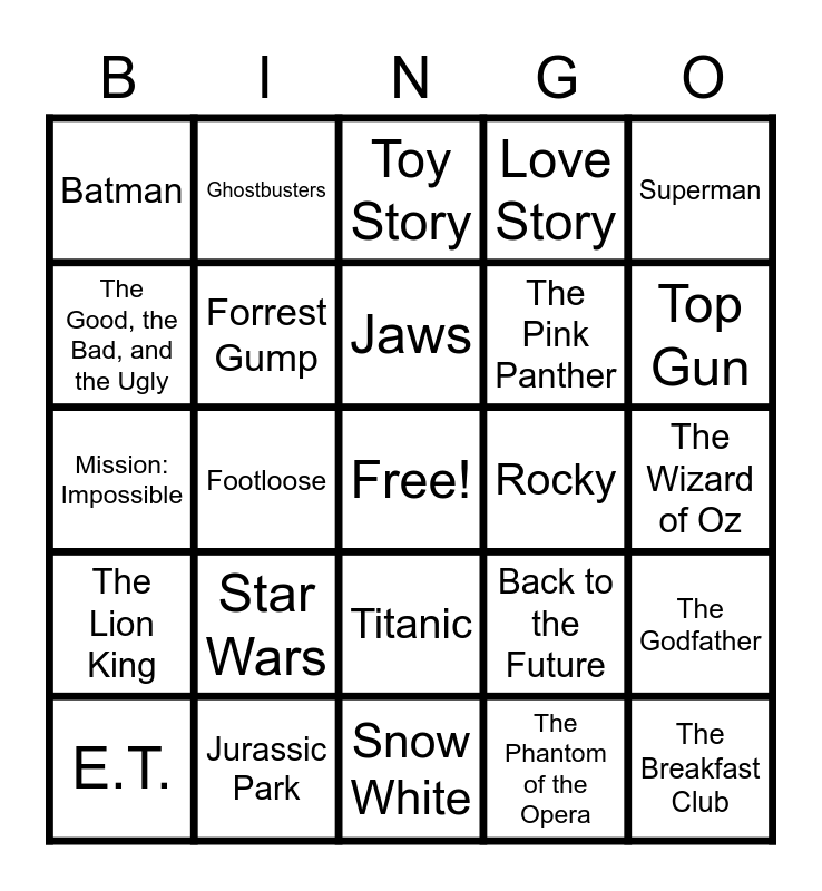 This bingo card has a free space and 24 words: Star Wars, Jurassic Park, Jaws, E.T., Superman, Batman, The Good, the Bad, and the Ugly, Ghostbusters, Rocky, Titanic, The Pink Panther, Mission: Impossible, Back to the Future, The Godfather, Forrest Gump, The Phantom of the Opera, The Wizard of Oz, Toy Story, Top Gun, Footloose, The Breakfast Club, The Lion King, Love Story and Snow White.