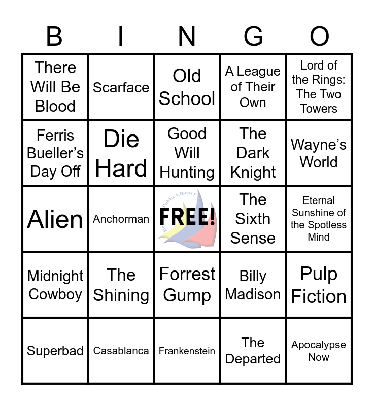 This bingo card has a free space and 50 words: The Usual Suspects, Apocalypse Now, Back to the Future Part II, Frankenstein, The Shining, Blues Brothers, Scarface, The Karate Kid, Ferris Bueller’s Day Off, Predator, Die Hard, A League of Their Own, Pulp Fiction, Billy Madison, Dumb and Dumber, Babe, Good Will Hunting, The Sixth Sense, Gladiator, Lord of the Rings: The Two Towers, Anchorman, The Departed, There Will Be Blood, The Dark Knight, Taken, The Help, Wayne’s World, The Princess Bride, Old School, Forrest Gump, Suicide Squad, Legally Blonde, The Devil Wears Prada, When Harry Met Sally, Casablanca, Funny Girl, Mean Girls, Grease, Harry Potter and the Sorcerer’s Stone, Eternal Sunshine of the Spotless Mind, Ladybird, The Breakfast Club, Austin Powers, Erin Brokovich, Superbad, Alien, Shawshank Redemption, Taxi Driver, Midnight Cowboy and Step Brothers.