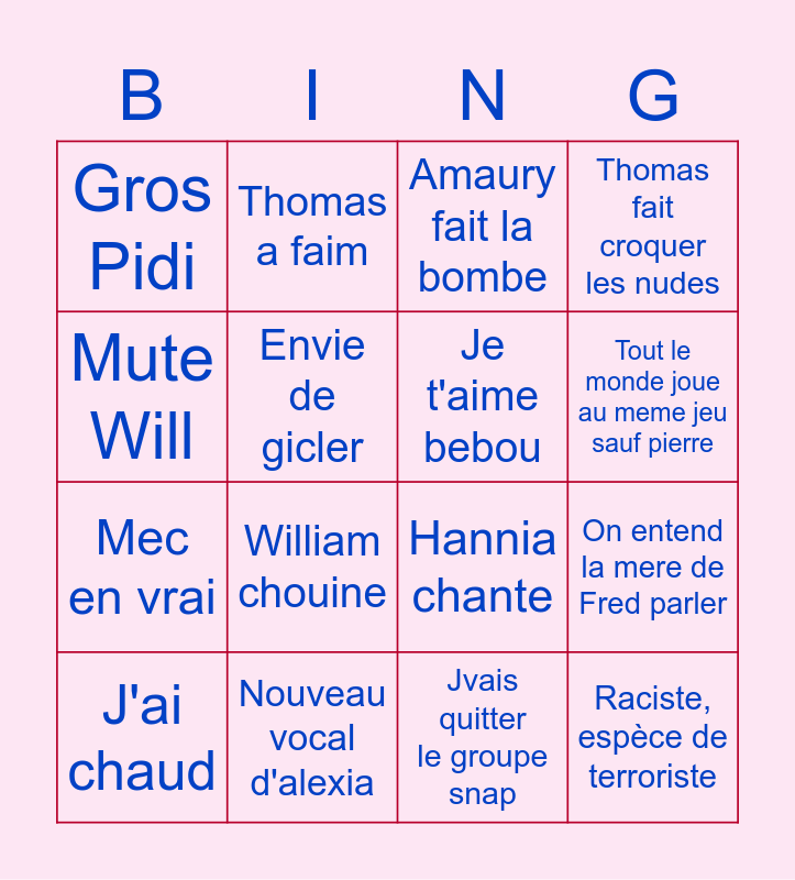 This bingo card has 16 words: Nouveau vocal d'alexia, On entend la mere de Fred parler, Amaury fait la bombe, Gros Pidi, Mec en vrai, Thomas a faim, Hannia chante, Jvais quitter le groupe snap, Mute Will, Envie de gicler, J'ai chaud, Thomas fait croquer les nudes, William chouine, Tout le monde joue au meme jeu sauf pierre, Je t'aime bebou and Raciste, espèce de terroriste.