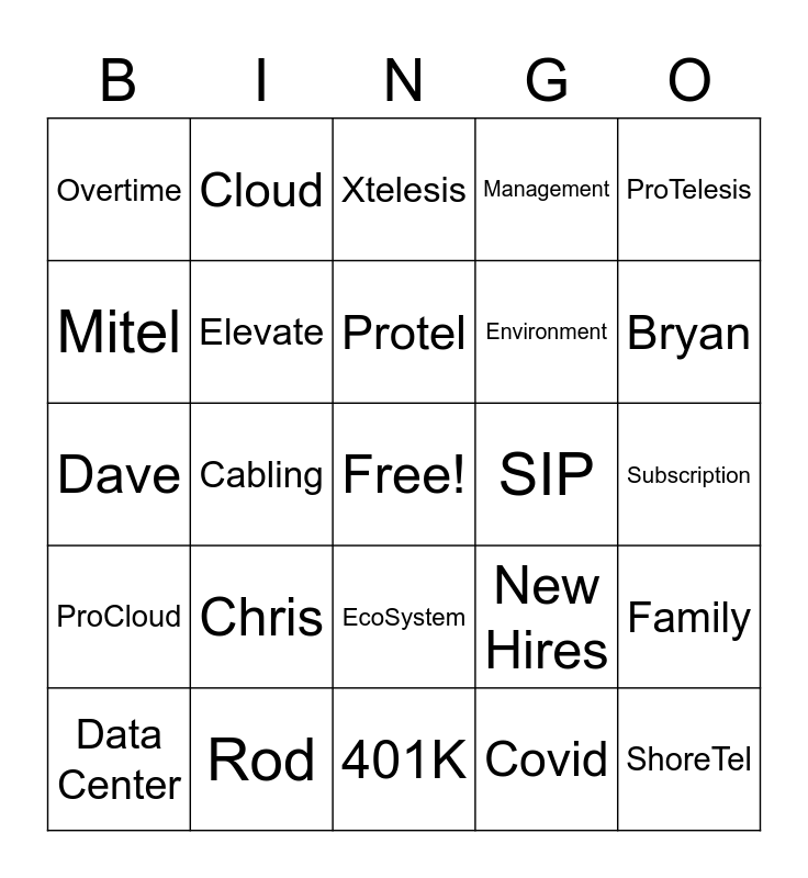 This bingo card has a free space and 34 words: MSP, Covid, CPaaS, UCaaS, ProCloud, Elevate, ProTelesis, Data Center, Cloud, Virtualization, Protel, Xtelesis, A/V, AutoTask, SIP, Bryan, Rod, Dave, Chris, New Hires, EcoSystem, Surveys, Overtime, Subscription, 401K, ShoreTel, Management, *Any Curse Word*, Environment, Mitel, Benefits, Cabling, Family and Teamwork.