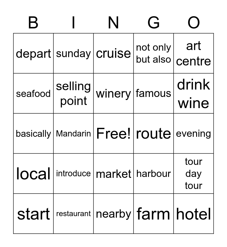 This bingo card has a free space and 29 words: start, English tour, Mandarin, Itinerary, depart, cruise, selling point, introduce, route, restaurant, evening, hotel, nearby, farm, drink wine, special offer, market, local, art centre, basically, harbour, next next month, famous, seafood, not only but also, sunday, tour day tour, winery and last month.