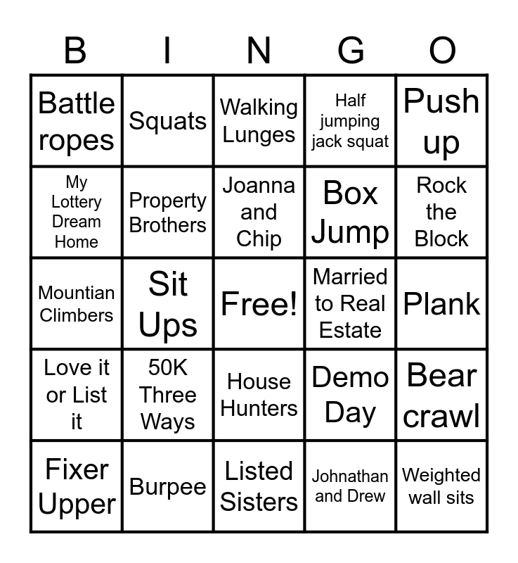 This bingo card has a free space and 24 words: 50K Three Ways, Burpee, Joanna and Chip, Fixer Upper, Push up, Battle ropes, My Lottery Dream Home, Squats, Married to Real Estate, House Hunters, Box Jump, Mountian Climbers, Demo Day, Bear crawl, Property Brothers, Johnathan and Drew, Plank, Walking Lunges, Rock the Block, Sit Ups, Weighted wall sits, Love it or List it, Half jumping jack squat and Listed Sisters.