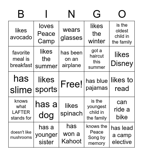 This bingo card has a free space and 24 words: has a dog, has a younger sister, has been on an airplane, doesn't like mushrooms, is the oldest child in the family, likes avocado, favorite meal is breakfast, loves Peace Camp, has blue pajamas, likes spinach, got a haircut this summer, has slime, is the youngest child in the family, can ride a bike, likes the summer, knows the Peace Song by memory, likes to read, wears glasses, likes Disney, likes sports, has lead a camp elective, knows what LAFTER stands for, likes the winter and has won a Kahoot.