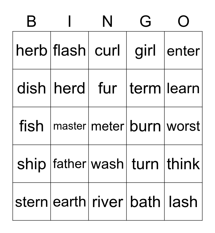 This bingo card has 57 words: Free!, stern, jerk, herb, river, fern, herd, germ, term, bird, girl, fir, stir, first, firm, dirt, enter, master, disaster, meter, burn, bird, turn, curl, hurl, fur, burst, hurt, learn, worm, Earth, pearl, worker, world, worst, dish, wish, fish, rush, ship, flash, wash, lash, math, birth, this, father, earth, moth, that, mother, bath, weather, feather, clothes, think and thin.