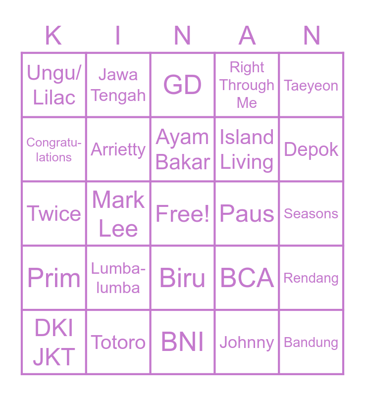 This bingo card has a free space and 24 words: DKI JKT, Lumba-lumba, Ayam Bakar, Johnny, Taeyeon, Ungu/ Lilac, Jawa Tengah, GD, Paus, Seasons, Twice, Arrietty, BCA, Rendang, Congratu- lations, Totoro, BNI, Right Through Me, Depok, Prim, Mark Lee, Biru, Island Living and Bandung.