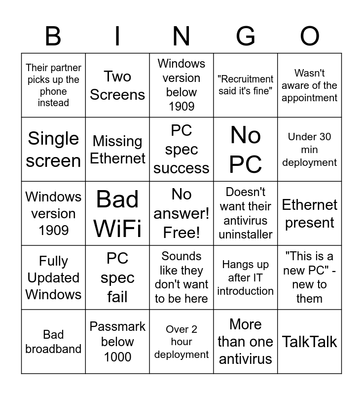 This bingo card has a free space and 24 words: PC spec fail, Passmark below 1000, PC spec success, Bad broadband, Wasn't aware of the appointment, Their partner picks up the phone instead, Single screen, Two Screens, Doesn't want their antivirus uninstaller, Sounds like they don't want to be here, No PC, Windows version 1909, Hangs up after IT introduction, "This is a new PC" - new to them, Missing Ethernet, More than one antivirus, Ethernet present, Windows version below 1909, Under 30 min deployment, Bad WiFi, TalkTalk, Fully Updated Windows, "Recruitment said it's fine" and Over 2 hour deployment.